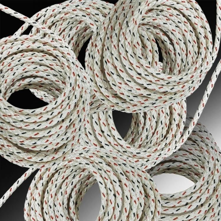 (ツイストされたコアと八打ちポリエステルカバーテンションを掛けた状態でロープに仕上げられています。)